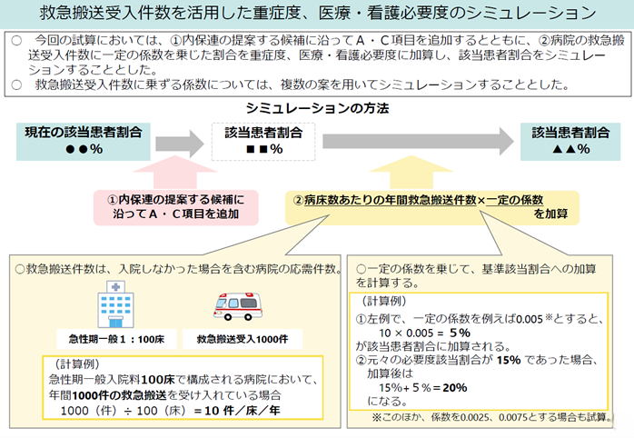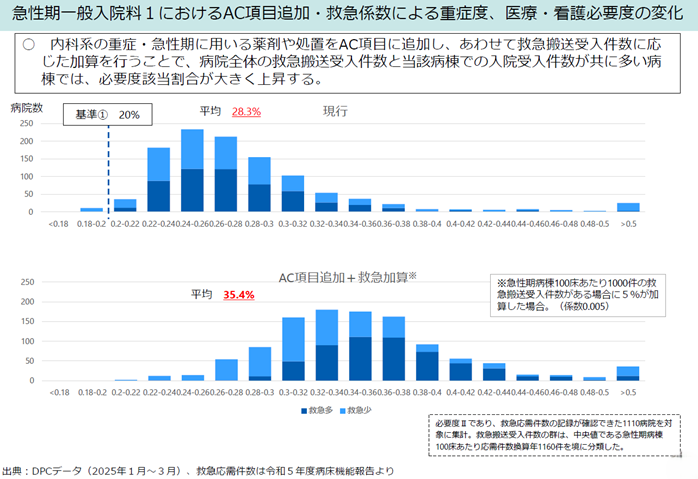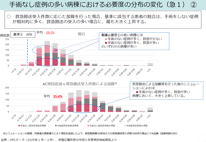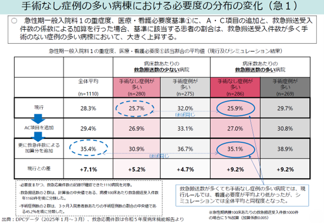 2026年診療報酬改定に向けた議論の中で、一般病棟用の「重症度、医療・看護必要度」(以下、看護必要度)において 内科症例が評価上不利になりやすい構造が改めて課題として示されています。この評価の見直し案として「A・C項目への内科的処置の追加」と「救急搬送受入件数等に応じた加算」の導入が示され、これらの見直し案に沿ったシミュレーションが実施されました。
