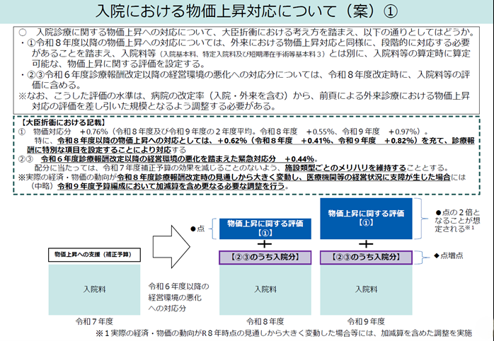 - 入院分野における物価上昇への対応については、将来的な物価動向を見極めながら段階的に対応する必要があるとの考え方が示されています。