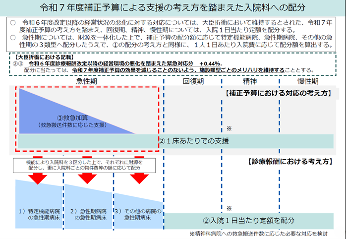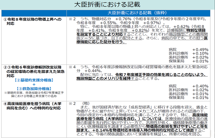 - 一方、2024年度診療報酬改定以降の物価・賃金上昇により生じた経営環境悪化への緊急対応分については、2026年度診療報酬改定において入院料等の引き上げとして反映する方針とされています。