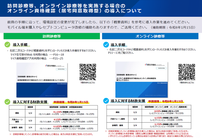 12月2日以降、訪問診療等やオンライン診療等に関してもオンライン資格確認等システムの導入が必要となります。モバイル端末購入やレセプトコンピュータ改修の補助が令和8年1月15日までとなっております。