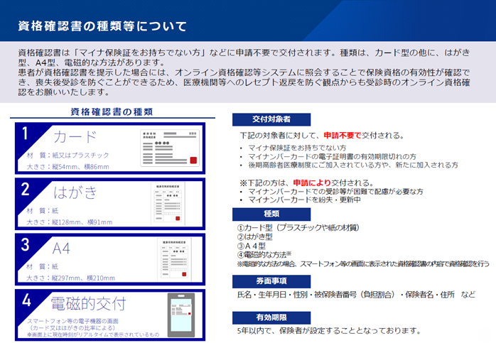マイナ保険証をお持ちでない方などに申請不要で、「資格確認書」が交付されます。こちらを患者が提示した場合は、オンライン資格確認等システムに照会し保険資格の有効性をご確認いただく対応となります。