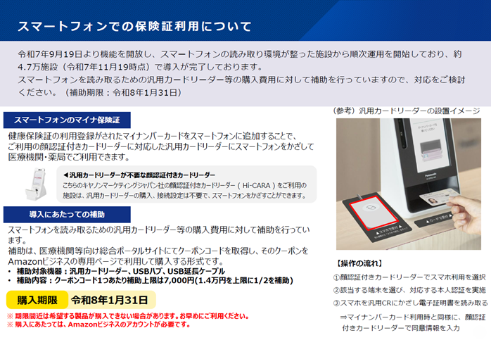 マイナンバーカードをスマートフォンに登録している患者に対して、スマートフォンを読み取るための汎用カードリーダー等の購入費用に対して令和8年1月31日まで補助行われております。医療機関等向け総合ポータルサイトにてクーポンコードを取得し、そのクーポンをAmazonビジネスの専用ページにてご利用いただき購入する流れとなっております。事前にAmazonビジネスへの登録が必要ですので、ご留意ください。
